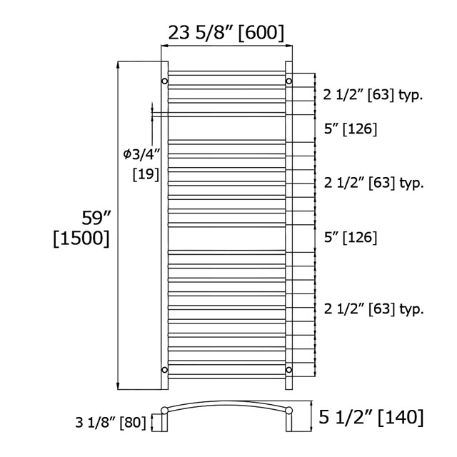 The towel hanging space between warming rails is 21” [536mm].