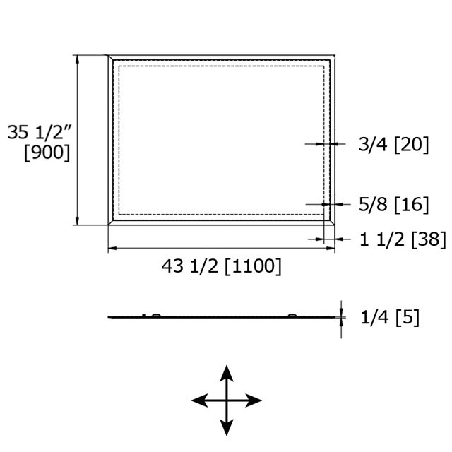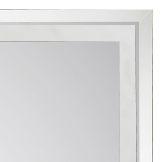 The 3/4” bevel surrounds a 3/4” frosted glass insert. The combined 1 1/2" frame is subtle and does not overpower other design elements of the vanity area. Tile, listellos, wallpaper or faucet details become the focus and the mirror provides the functionality.