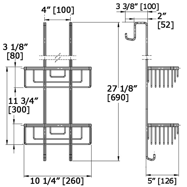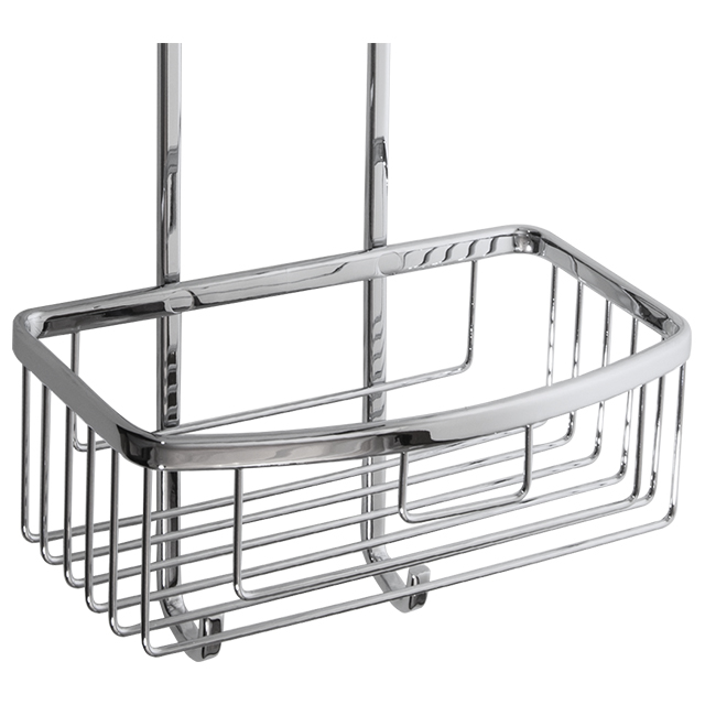 The Chrome Double Hanging Wire Basket is a catchall for shower essentials and can be installed over a shower door without the need for screwing to the tiled or acrylic surface. The upper clips are protected with silicone sleeves to prevent scratching. The distance between shelves is 8 5/8" with a clearance of 5 1/2".