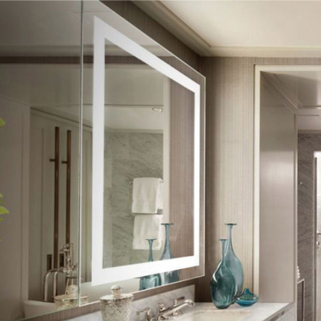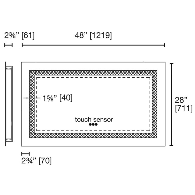 The rectangular backlit mirror has insert lighting on all four sides. The LED strip shines through a frosted 1 5/8” opening in the mirror. The opening is large enough to illuminate the face and provide ambient light in the room. The 3 button sensor controls the colour of the light (Kelvin) and the brigthness of the light (Lumens).