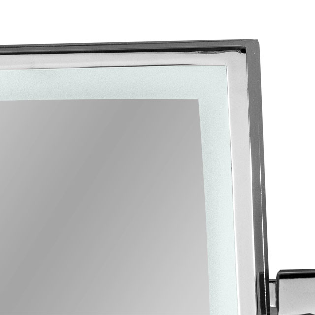 The mirror surface is 5x magnification. A LED lit strip surrounds the reflection surface. The square chrome frame coordinates with a minimalist bathroom design.