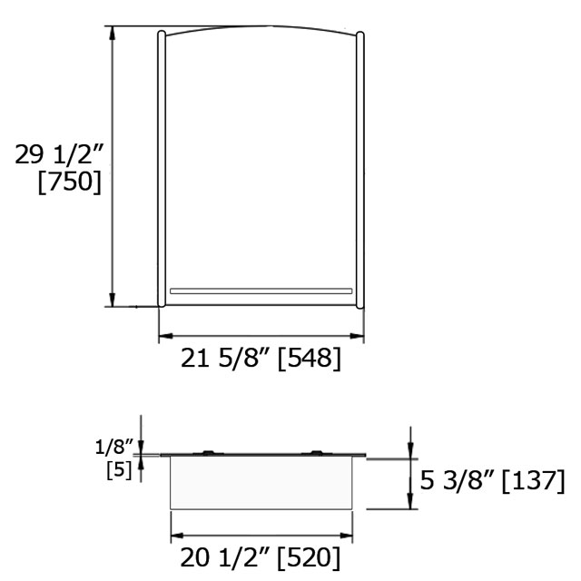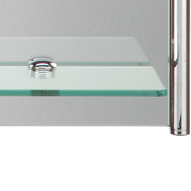 The rectangular mirror is multi-functional with the addition of a lower glass shelf. The mirror is dramatic with chrome rolled bar accents to the left and right of the reflection area.