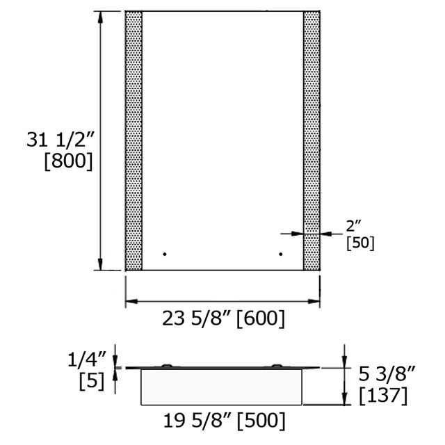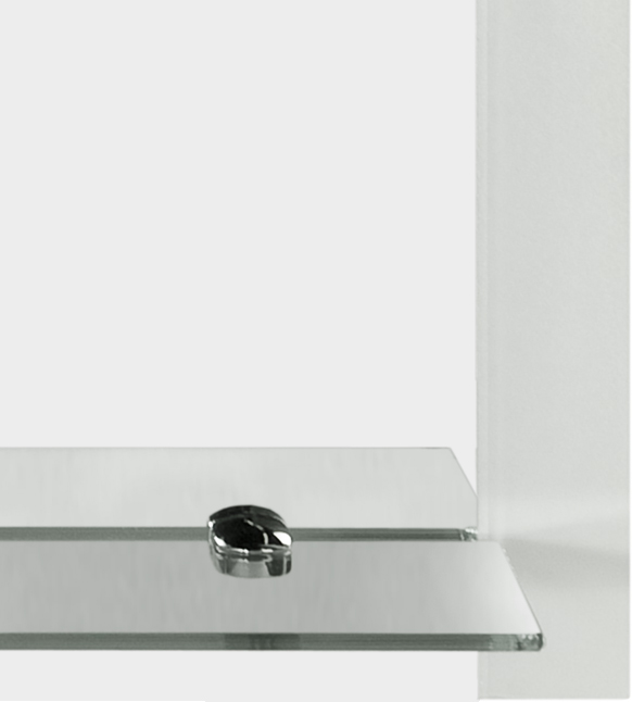 This rectangular mirror is multi-functional with the addition of a lower glass shelf. The mirror has clean simple lines with no bevel around the edges. The left and right side has a 2” frosted frame. The upper and lower edges are free of accents; elongating the perceived height of the mirror.