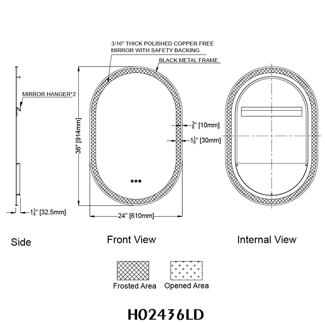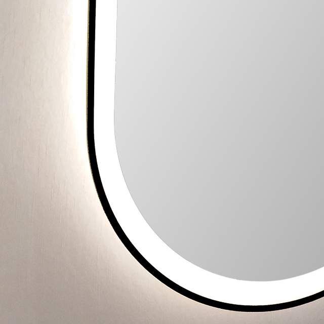 The oversize oval backlit mirror has ‘perimeter’ lighting. The LED strip shines through the frosted 2” glass frame. The mirror has a 3-button Touch Sensor which controls the colour of the light (Kelvin) and the brightness of the light (Lumens).